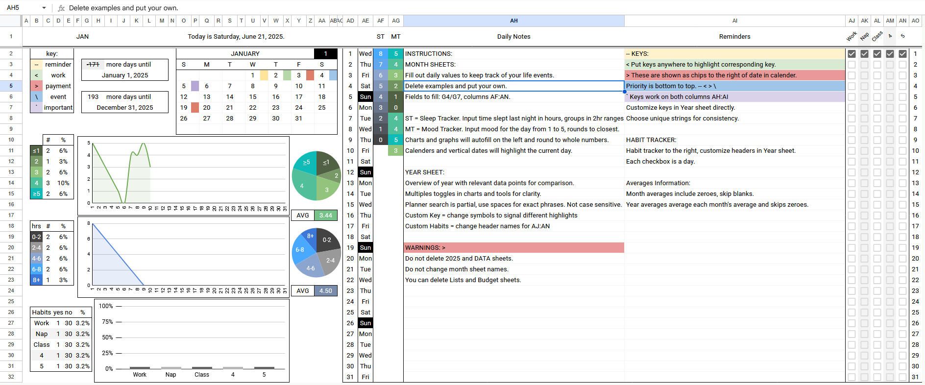 Custom built module focused spreadsheet to track multiple aspects of your daily life.